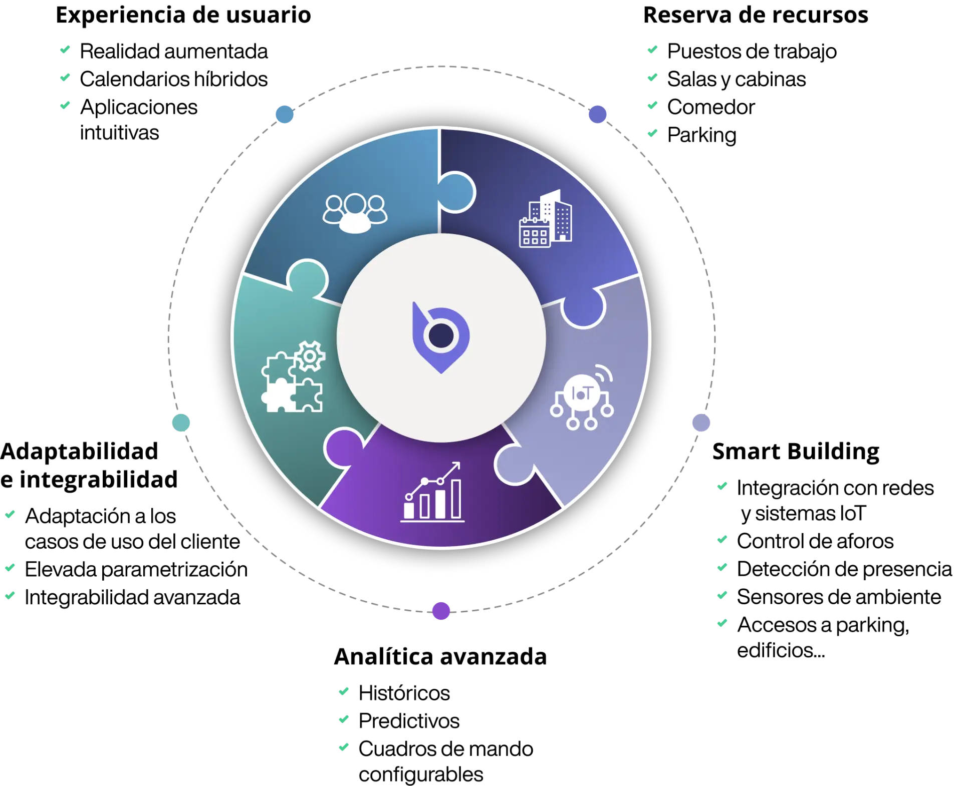 Gestión de recursosOrganiza los recursos (puestos, salas y comedor) por zonas o barrios y configura reglas de uso para los mismos. Tus empleados podrán reservarlos de forma sencilla. | Gestión de parkingGestiona de forma eficiente y democrática el uso del parking y cargadores eléctricos. Permite a más empleados hacer uso de estos recursos. | Gestión de aforosMide y consulta en tiempo real la ocupación de tus usuarios y espacios como salas de reunión, comedores, zonas de vending, baños… |